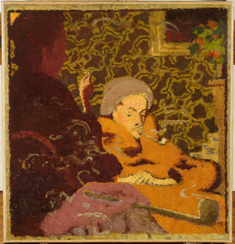 The debonair manners of the art that Bonnard began to put forward came with a conceptual weighting. In his essay, “A Desire for Dispossession: Portrait of the Artist as a Reader of Mallarmé,” Rémi Labrusse explores how Bonnard attuned himself to the nuances of that poet’s thinking. The questions at hand ran thus, insofar as we can simplify them. Are surface appearances—so atmospheric, so misty, so mazy, so puzzling as they may be—all we can ever know of the world? Will its essence forever elude us? Or alternately, is the appearance, the atmosphere itself, as it is apprehended and given form by the artist’s or the poet’s sensibility, none other than that essence itself? Speculations along these lines were aired by Mallarmé, who had picked up cues from the emerging Impressionist art of the 1870s. The young Bonnard who paints Intimité in 1891 responds to those speculations, weaving all phenomena, whether near or far, into a delicious and depthless delirium. At the same time, the image’s insistent play of patterns nods to a more recent agenda: that the art of a fresh era, of the century to come, should aestheticize whatever ambiences its urban audiences might occupy; that by way of decoration, poetic subtleties might converge with progressive aspirations, with the painter thus becoming society’s servant.