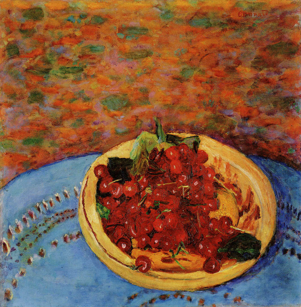 The dominant opposition is effectively a clash of metals. Iron against lead. To one side of Bonnard’s palette, we have the primary, instinctual, somatic herenesses: the ferrous oxides, the ochres, siennas, Mars and Indian reds. Beyond them, a yearning for added stimulus has him reaching for “violent” cadmium reds—for instance, in those cherries. While working with such hues, the painter is of a piece with what he paints: it flows with his blood. Swing the dial the other way, and you hit Cremnitz and flake whites, lead carbonate products. White, as Bonnard lays it down, is what does not pulse. It has to do with artifice and the snowfall-like effacement of nature and of immediate sensation. This cold brilliance, this anaesthetic absolute, corresponds to the intrinsic strangeness of Flatland, of the pictorial universe to which he commits himself in his work. Dita Amory has noted how Bonnard’s linen tablecloths can become analogues for the very pictures they sit within—these othernesses, arisen out of his own warm-blooded experience.2