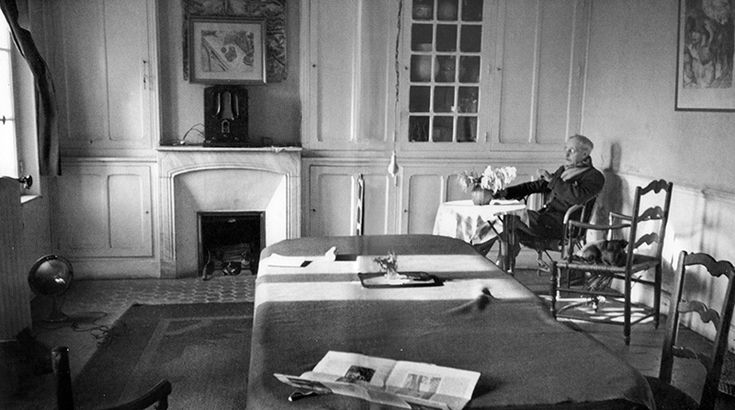 In this shot, what seem the self-same sprays are placed in the self-same jug, albeit in afternoon sunlight. For the purposes of the painting, the table on which the jug is perched must have stood to the left-hand side of this shot since on close examination of the canvas you can just make out the window, with the same window catch at the top left that the photo displays. To underline, then: there are all these anterior facts underpinning almost every mark in the canvas; and that is a characteristic referential hinge when it comes to Bonnard’s work. In this sense, his art is eminently “representational,” even if not in the way that a photograph is. For his part, Cartier-Bresson was training his camera on a seventy-six-year-old who had been alone for the past last two years—Marthe, his companion for most of the previous fifty, having died in January 1942—and perhaps we can read a hint of Bonnard’s widowerhood in the faintly dishevelled state of the room that the old man sits in.