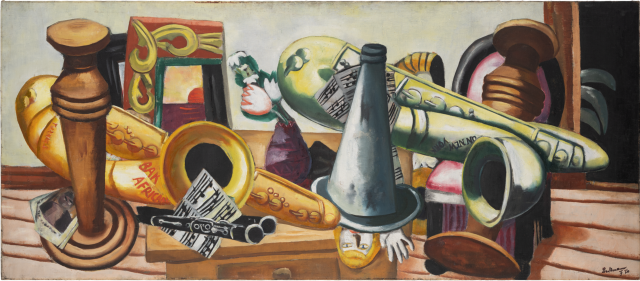 Looking to the falling man’s left side (his right), we again see how the sky shifts between flatness and depth, ground and groundlessness, in the blue-and-white cone that forms in the gap between his torso and the yellow building (fig. 11). Its pink-hued tip models the solidity of its rounded form even as it dissolves into thin air. A recurring motif, cones appear in various guises throughout Beckmann’s work: from the 1948–49 watercolor and gouache Early Humans to the 1925 painting Galleria Umberto to his 1921 Self-Portrait as a Clown, among many examples. In each case, the cone serves as a form that funnels space down or through while pushing up and out. This can take the form of forced air moving through a horned instrument, as in Still Life with Saxophones from 1926, or our vision as it propels through space, as in the 1927 Still Life with Telescopes (fig. 12). In the case of Falling Man, the cone serves as both a funnel-shaped chute that accelerates and directs the man’s movement downward and, at the same time, a parachute flattened out and seen from above, arresting movement and suspending the man in space.