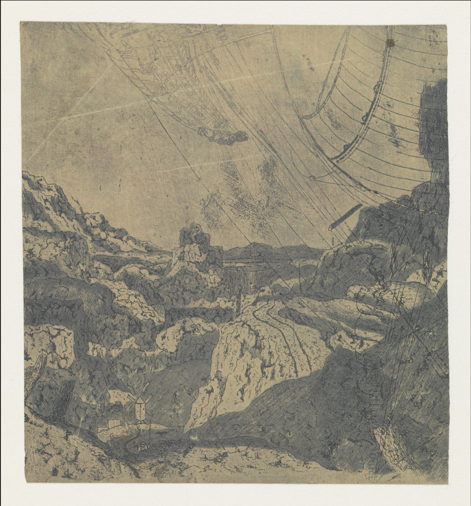 Although Einstein could not have been thinking about Beckmann’s Falling Man when he wrote these words, he was—as Sebastian Zeidler has made clear—thinking very much of another artist: the seventeenth-century Dutch printmaker Hercules Seghers. Having published an essay on the artist’s etchings in the journal Documents the year before, Einstein was particularly taken with Seghers’ 1625 Mountain Gorge by a Road (fig. 3). Produced by reusing a previously worked etching plate, the final landscape overlaps and merges with the ghostly bow of a massive sailing ship. As Einstein describes the resulting palimpsest, “This is the uninhabited desert. Seghers banishes air, the sign of flux and vital movement. At times the clouds assume the forms of boulders. … a ship’s rigging scratched into the sky… a sailor scales the ropes. Here we see a new symptom of anesthesia: the sea is identified with rock, flowing water is equated with dead matter, death is, as it were, transferred to animate matter.”7