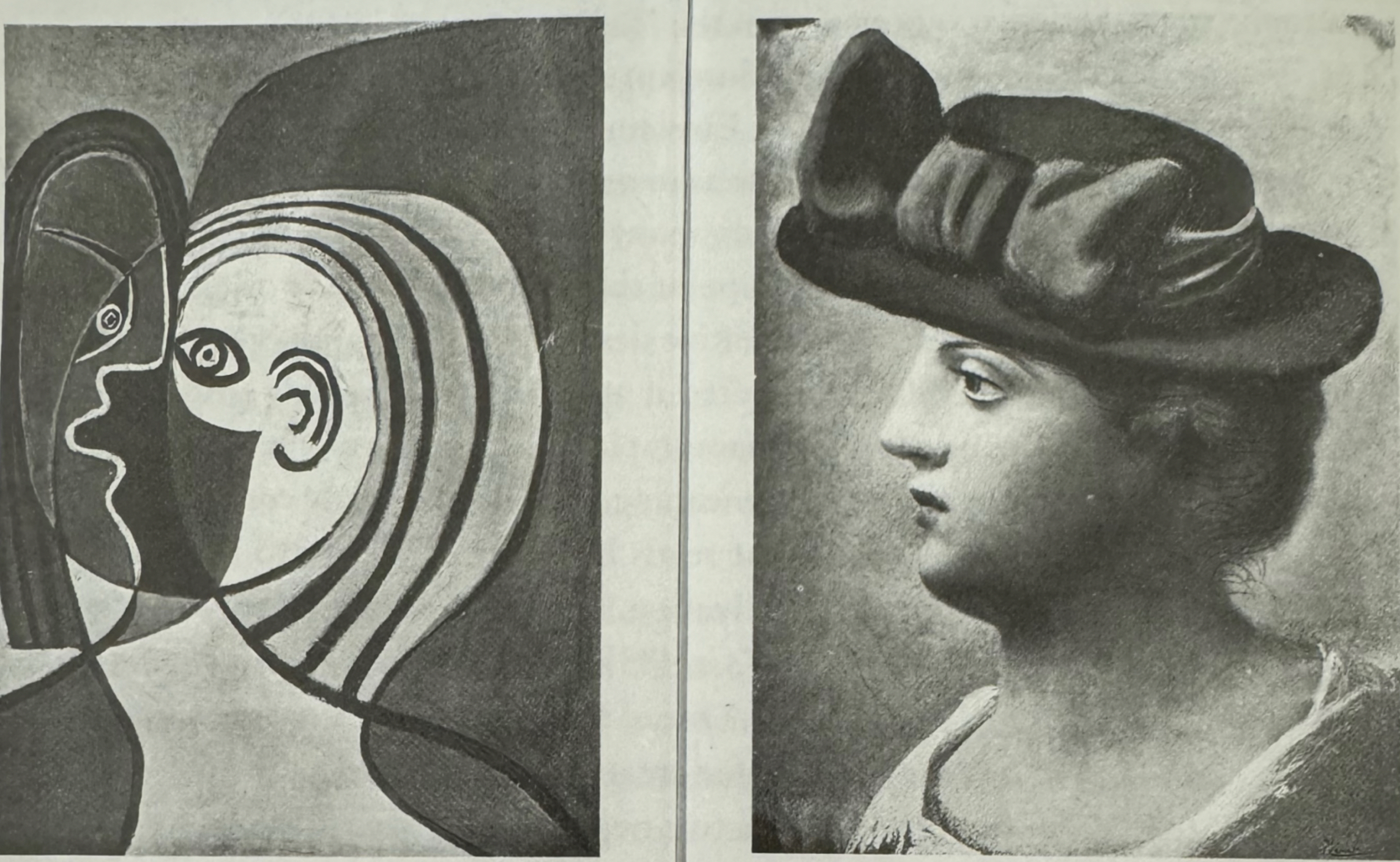 At times, as Zeidler demonstrates, Einstein foregrounded Picasso’s double style quite literally, as evidenced in the repeated side-by-side comparisons of the artist’s work in the pages of Documents. In the double-page spread that precedes his contribution to the 1930 special issue on Picasso (fig. 5), for example, Einstein juxtaposed a neoclassical pastel—Woman with a Red Hat from 1921—with the Surrealist Head of a Woman, painted eight years later. Not only does the neoclassical “tectonic” image fold directly onto the Surrealist “hallucination” when the pages are shut, only to separate and rejoin with each new opening and closing, but both images are also internally doubled. We see this most clearly in the two warring halves of the unambiguously divided head of the 1929 painting. But as Zeidler points out, a similar internal division is also present, if less obviously so, in the earlier pastel, as the fleshy hat appears at once integrated and at odds with the neoclassical head on which it sits, the almost grotesque bow appearing as a kind of unconscious thought bubble to the sitters’ repressed instincts.17