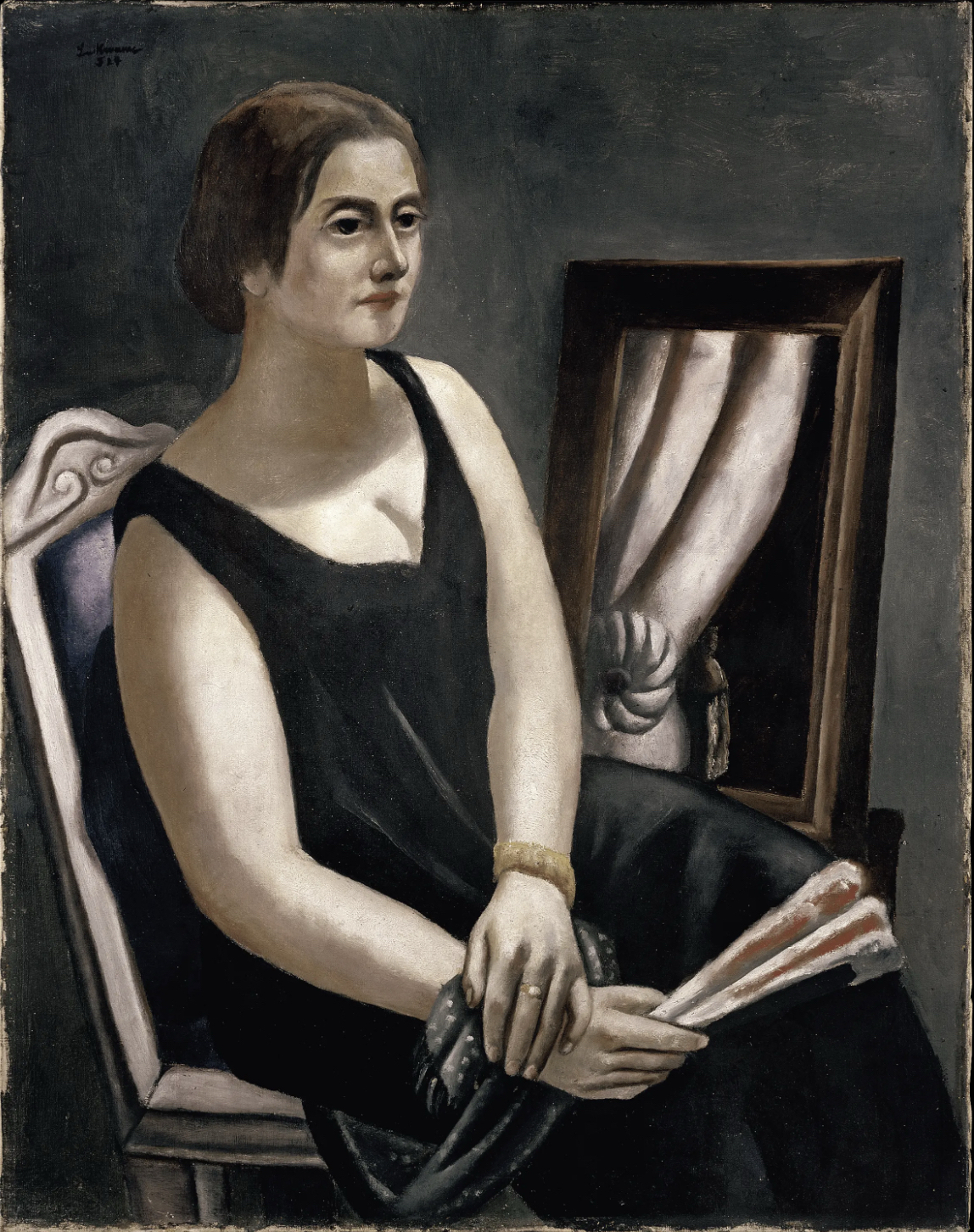 It is this unexpected irruption of the repressed into the space of neoclassicism that Picasso’s influence on Beckmann’s so-called verism of the early 1920s is felt most keenly. Apparent not just in terms of its purported rappel à l’ordre neoclassicism and subject matter—“one would be hard pressed to deny the obvious influence,” as Hans Belting puts it—it is their shared engagement with the “double style” that separates them from the crowd of the genuinely conservative Return to Order.18 Indeed, if we were to take, for example, Beckmann’s 1924 portrait of his first wife, Minna Beckmann-Tube (fig. 6), one could easily argue that Beckmann’s particular version of the double style places the opposition of tectonic classicism and Dionysian flux under greater tension than Picasso. Much like Woman with a Red Hat, Beckmann’s portrait appears at first glance entirely straightforward in its juste milieu neoclassicism. But to leave it at that would be to miss not only the oddly meat-like quality of the fan in her right hand but also the even more unsettling and transgressive image of the curtain reflected in the mirror to her left. Unsettling not so much because it seems as if, because of its placement and angle, the mirror should be reflecting the sitter rather than the curtain but because there is a perverse suggestion that Beckmann’s wife is precisely what we see in the painting-like mirror image against the wall. For not only does the rectangular form of the chairback appear to double the rectangular form of the mirror, implying a certain visual reciprocity between the contents of the two oblique frames—torso and curtain—but the corporeal qualities of the curtain seem to reflect the bodily qualities of the sitter. This is evident, perhaps most obviously, in the hoary-pink European-flesh colored fabric and the way in which the curtain’s outer fold “mirrors” Beckmann-Tube’s left arm, both of which seem to touch elbows at the curtain tie. Above all, however, it is the curtain tie’s unmistakably anus-like appearance that is the most corporeal, most transgressive aspect of the mirror’s reflection. Much like the slightly grotesque bow in Woman with a Red Hat, the anus curtain tie erupts into the field of representation, reflecting not the outer appearance of the rather prim sitter but the repressed internal instincts that, like the tie that pulls back the curtain on the dark void beyond, holds everything in place. Perhaps this is what Einstein had in mind when he wrote cryptically that “Beckmann no doubt attempted to bring together something like an aggregate of modernism,” trying “not to elude the conflict between artistic preconception and empirical motif, but rather to escalate that conflict into an almost tragic confrontation.”19