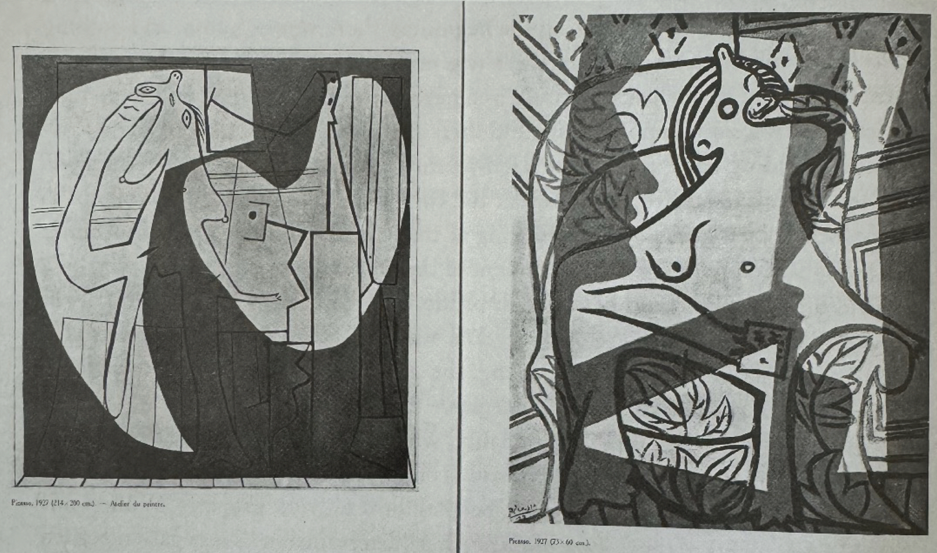 Zeidler’s second example of the double style is another pairing of Picassos in Documents (fig. 7): The Painter and His Model from 1927 and Woman in an Armchair from the same year. In the latter painting, two neoclassical silhouettes, one in shadow, the other in light, overlap the Surrealist female nude, over and at whom they exchange glances. The protrusions extending from the heads of both profiles create a suggestion of symmetry, as if above and below could serve equally as necks. This invites the viewer to imagine the painting flipped on its head, making visible the conjoined twins of each silhouette formed at the intersection of contour and tone. The Painter and His Model likewise doubles the play of light and line as the linear images of the artist at his easel on the right faces off against his monstrous sitter on the left, each appearing caught in the twin spotlights that Zeidler describes as a crescent and a kidney. For my part, I would argue that “the kidney” is, in fact, a palette, emphasizing the more overt three-sided rectilinear palette and thumbhole that appears at the end of the painter’s zig-zag arm, while “the crescent” gives form to the hairs of a brush, seen from the side, being dragged across the surface of a canvas. This, in turn, enlarges the artist’s other hand. I’ll return to the painter’s self-projection into the canvas as I move towards a conclusion.