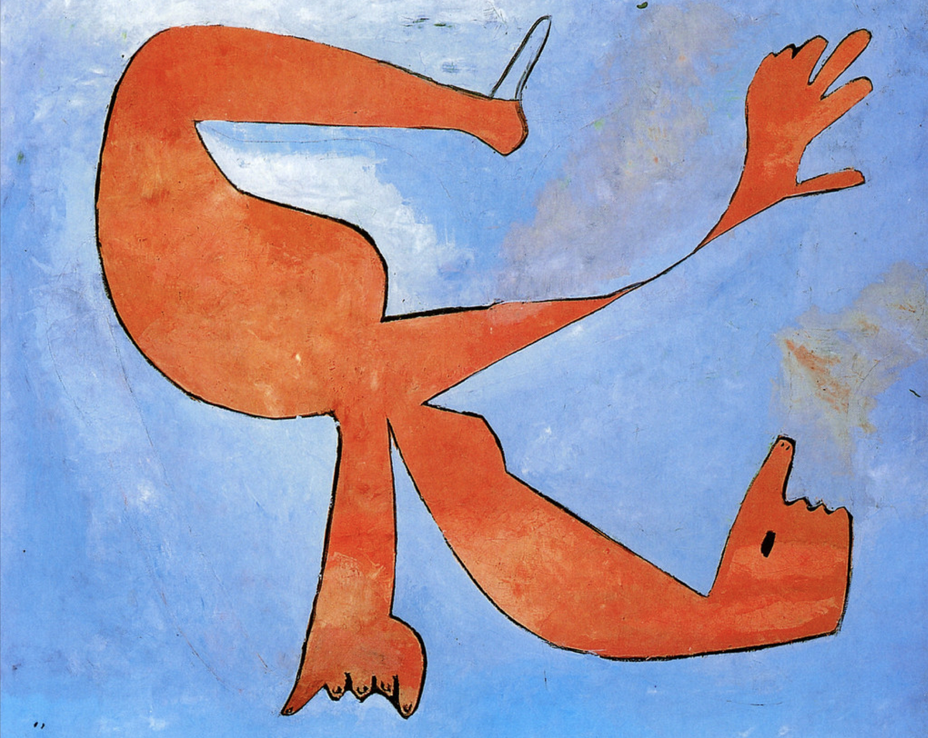 I begin with three representations of falling, one visual—a painting by Max Beckmann titled Falling Man produced shortly before his death in 1950 (fig. 1)—and two written: my epigraph from Joyce, with which I’ll also conclude, and an excerpt from the poem Design for a Landscape by Carl Einstein published in 1930: