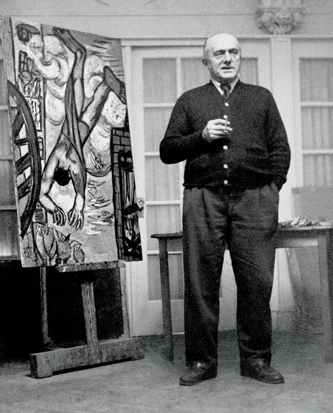 Grounded, groundless, and swimming: we return full circle to the image of Beckmann’s Falling Man. Here too, I would argue, we see the image of the figure—simultaneously falling, fallen, and floating—as a projection of the artist into the painting, flipped on his head. Clamped between two buildings, the white-blue expanse of air-turned-ground-turned-water reflects the expanse of white-painted canvas clamped within the architecture of the painter’s easel, as seen in a photograph of Beckmann in his East 19th Street studio in New York (fig. 10). Again, the fingers of the man’s hands take on the form of the artist’s brushes, as do the plants below. At the same time, both the quarter-circle of earth and the balcony above can be seen as intrusions of Beckmann’s palette into the painting. More significantly still, what I had been seeing as the terra firma endpoint of the man’s fall into the quarter-circle of dirt and plants can just as easily be seen—thank you Chuqi Min for pointing this out to me—as the floating leaf or lily pad of its accompanying lotus flowers, flipping solid ground into another image of floating.