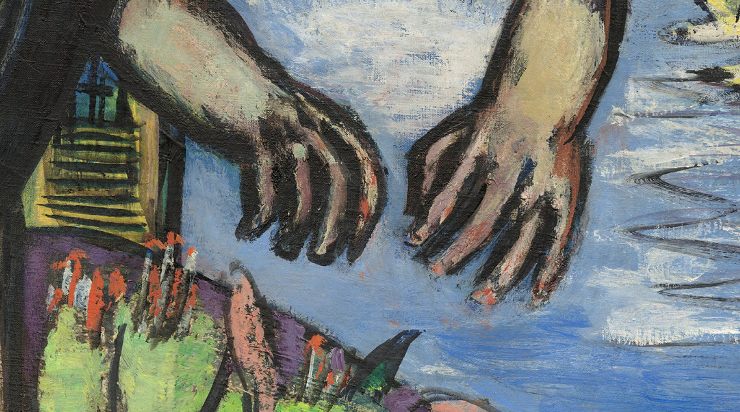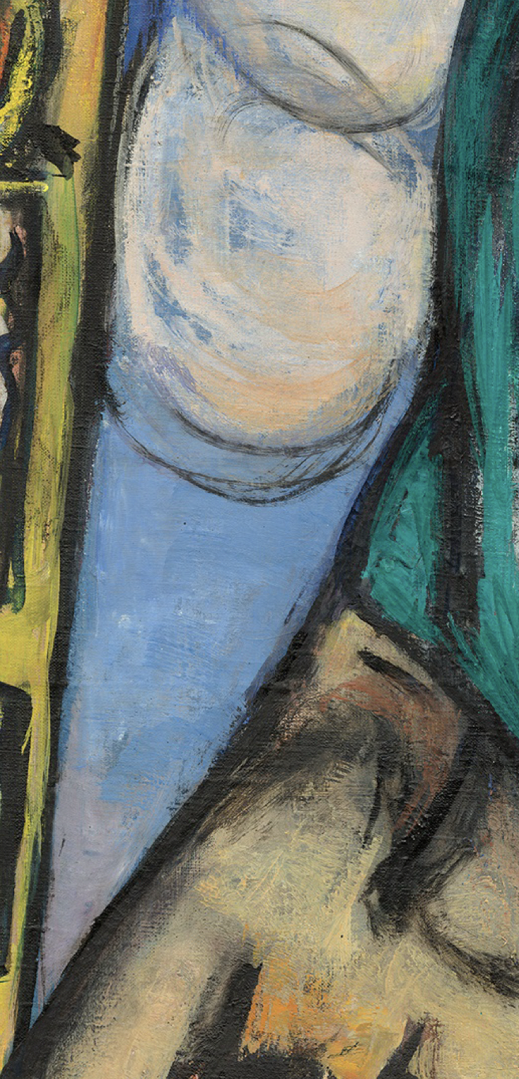 Shifting from the second person “you” of the poem to the third person “him” in Beckmann’s painting, the nearly naked figure cuts a diagonal swath across the clouded blue sky, plummeting headlong through space like a toppled statue, stiff and impassive, as if knocked from its perch. In Einstein’s poem, the fall is “suspended” not because it appears frozen in pictorial time, as in Falling Man, but because it is “Entangled / In the contradiction / Between image and ground.” We get a sense of what Einstein might mean by this, and what such an entanglement might look like, in the image of the downward fall of Beckmann’s figure and his simultaneous ensnarement and compression into the painting’s surface. Indeed, Falling Man presents us with two very different types of ground, each in “contradiction,” as Einstein puts it, with the other. On the one hand, and most obviously, we see the depicted ground: the endpoint of the man’s downward fall in the quarter-circle of earth and plants at the base of the building in the lower left corner. On the other, we see the flat, material ground of the pictorial support asserted throughout the painting.