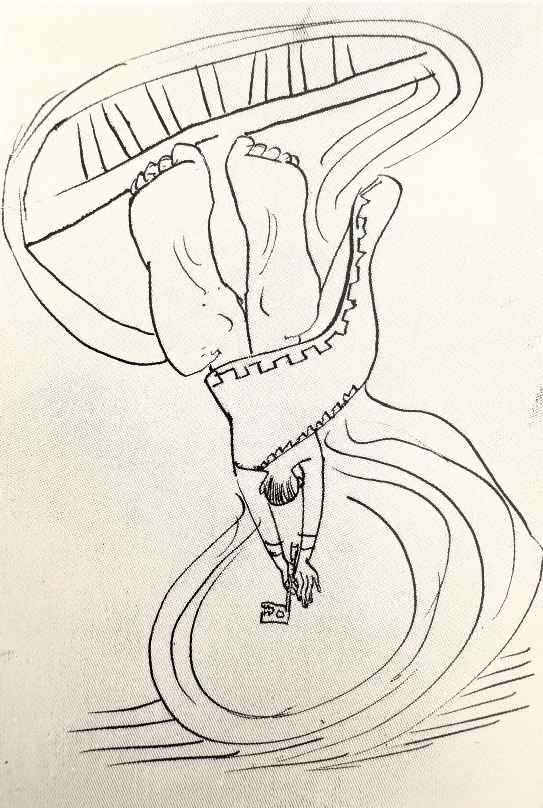 Not coincidentally, the cone—or more accurately, double cone—appears as the central compositional element within one of the most direct precedents to Falling Man: Beckmann’s 1944 ink-on-paper illustration to Mephistopheles’ speech as he sends Faust to the groundless realm of The Eternal Mothers (fig. 13). “Descend, then! I might also tell you: Soar! / It’s all the same. Escape from the Existent / To phantoms’ unbound realms far distant!”21 The dual directionality—up and down, in and out—of Beckmann’s recurring cone motif is made explicit in the hourglass shape that flips the sands of time in both directions. Formed through two interlocking cones that taper towards the figure’s hands at one end and feet on the other, the figure-eight pushes and pulls Faust in both directions as he descends and soars. As in Falling Man, we see the rounded railing of the balcony from which he plummets at the top of the drawing. But as we soon notice, the balcony doubles as a set of teeth, combining with the pattern on Faust’s jaw-shaped toga to form a mouth that chews and swallows him whole. Into the rounded stomach, Faust falls headlong down the chute only to be vomited back with each new turn of the hourglass. Descending and soaring, as Goethe writes, “It’s all the same.”