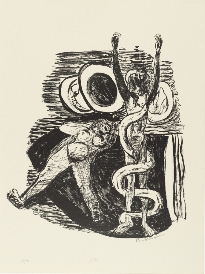The other evident forerunner to Falling Man is The Fall of Man in Beckmann’s 1946 portfolio of fifteen lithographs titled Day and Night (fig. 14). Seen from face on rather than behind, the figure of Adam assumes the same basic stance as Beckmann’s 1950 painting: stiff and impassive with his arms above his head, legs straight, feet splayed outward. In addition, the serpent that winds its way around the man’s body in the lithograph becomes, in Falling Man, the green toga that wraps across from the falling figure’s torso from his left elbow down to his right knee. Most notably, however, the man’s head seems to be entering some kind of circular opening or portal, much like the image of Faust set upright.