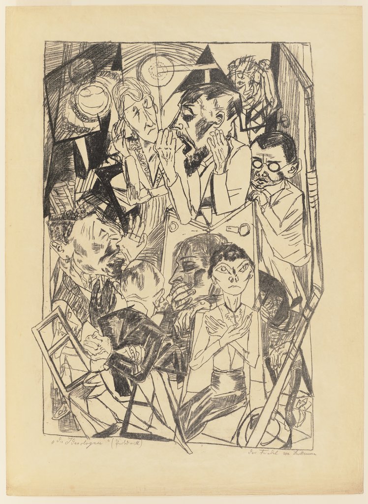 Beckmann and Einstein had been aware of each other and each other’s work from as early 1916 when Einstein began a long-term romance with the Countess Augusta vom Hagen, Beckmann’s friend and patron since their initial meeting in Paris in 1904. Beckman makes the connection explicit in his 1919 lithograph, “The Ideologues” (fig. 2), in which he pictures himself next to vom Hagen and Einstein.3 Beckmann had likewise written sporadic but favorable snippets on Beckmann’s work, most significantly in his substantially revised third edition of The Art of the Twentieth Century published in 1931.4 But in comparing Falling Man with Design for a Landscape, I want to connect Beckmann with Einstein less directly, through their shared concern with being simultaneously grounded and groundless.