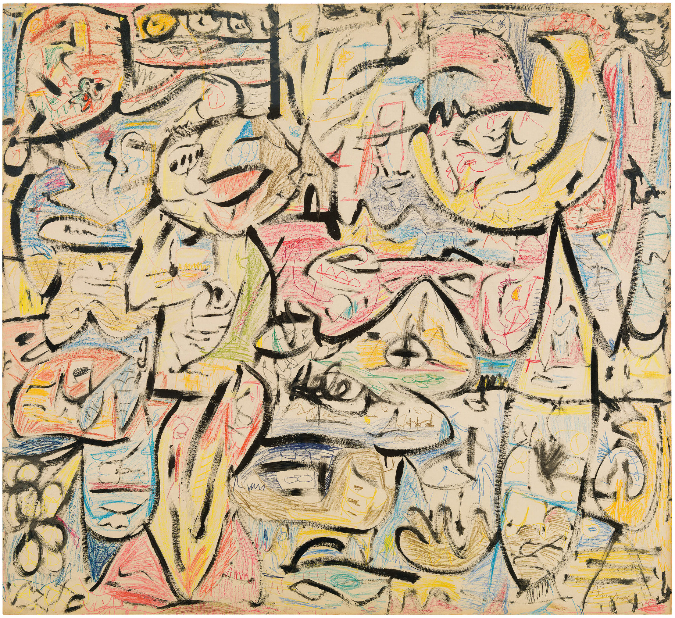 However, another 1958 painting, Hotel Cro-Magnon, differs in that the drawing simultaneously describes the famous bull at Lascaux and lays out the pictorial composition. With few later exceptions, the drawing of a source, actual or imagined, and the drawing that composes the painting are as one.