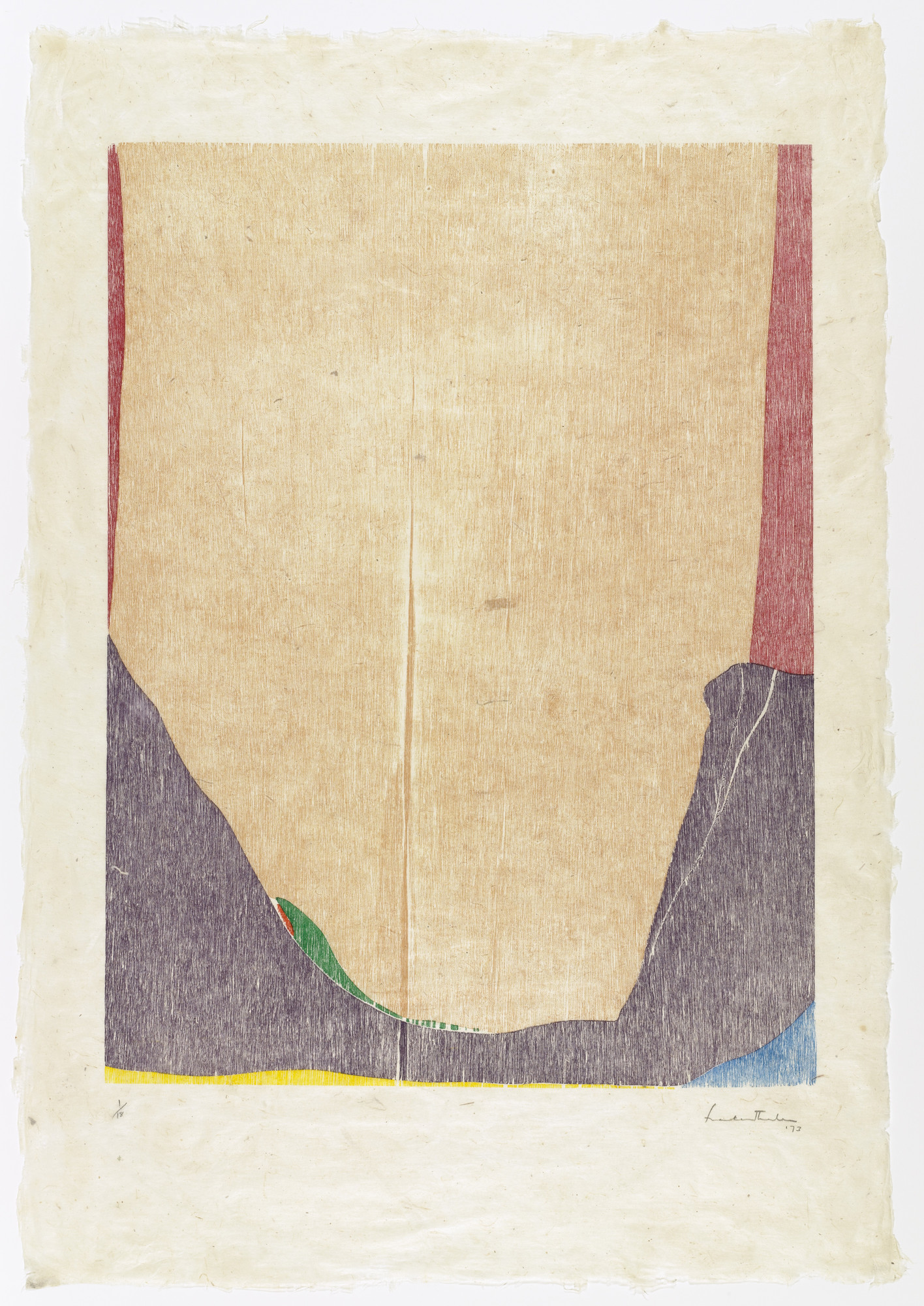I find it worthy of notice that, in 1963, Frankenthaler rescued some overworked paintings by turning them over and seeing what she called “a stained memory on the other side,” including parallel lines recording the floorboards on which they had laid: these paintings were effectively monoprints on a wooden matrix. It would be exactly a decade before she made her first woodcut, East and Beyond, for which she had to learn how to use a jigsaw to cut out the eight mahogany blocks from which it was printed. An accidental discovery in her studio on the one hand, a long artisanal process on the other. Thereafter, the advancement of her practice appears to have been aided by her periodically interrupting making paintings, which took only hours or days to complete, by making prints, some of which occupied her for months.